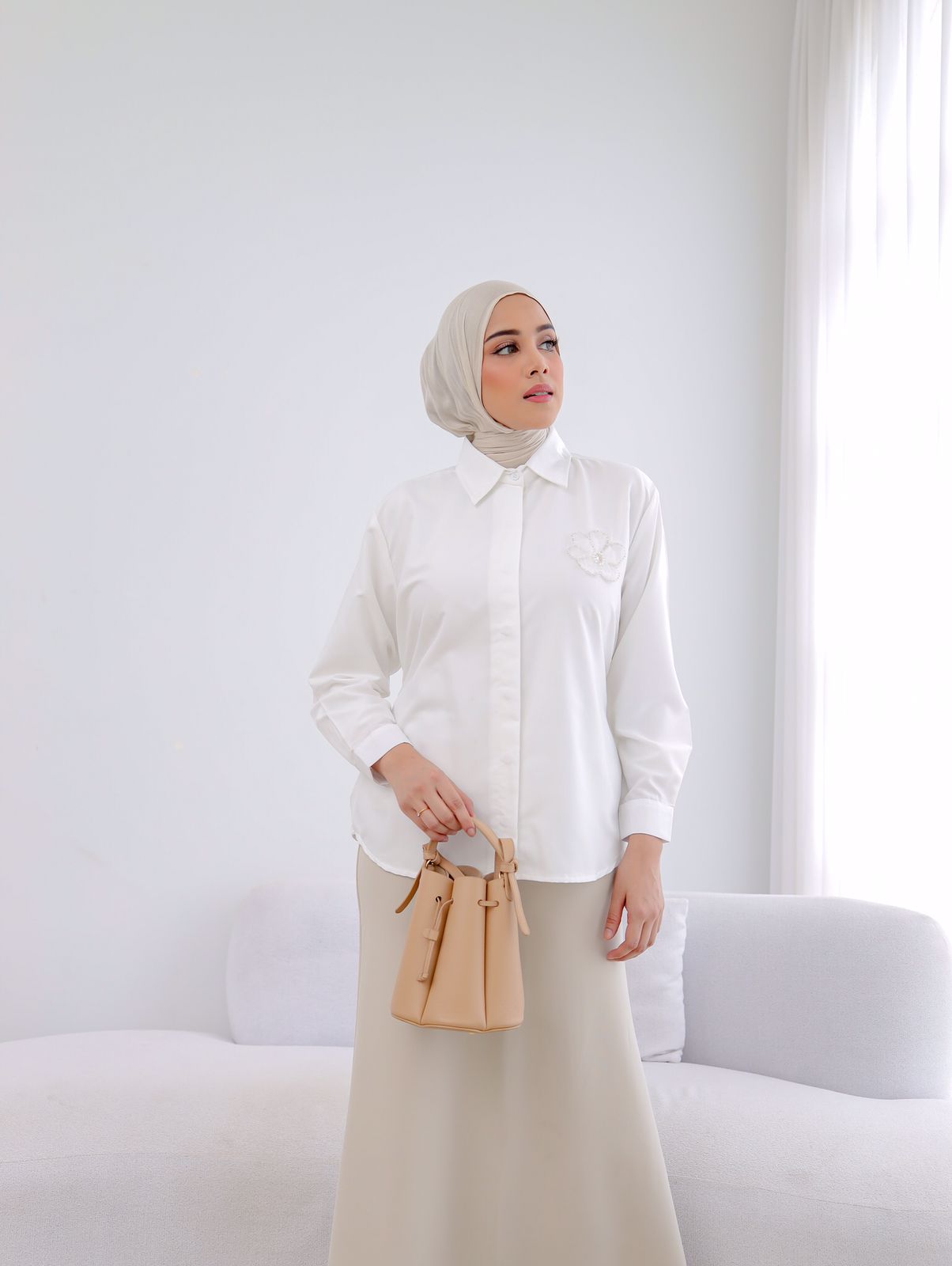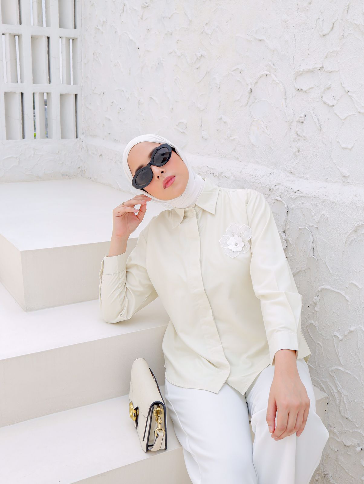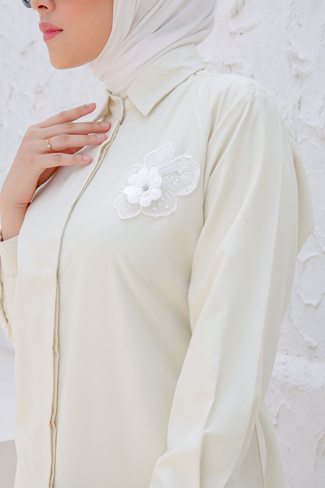 Bahannya lebih lembut dari pada poplin biasa, bahannya juga adem, tidak kaku, tidak terlalu tebal, halus, sedikit efek glossy dan juga bahannya flowy jatuhya cantik saat di pakai. Detail lace bunganya dijahit jadi gak gampang copot.