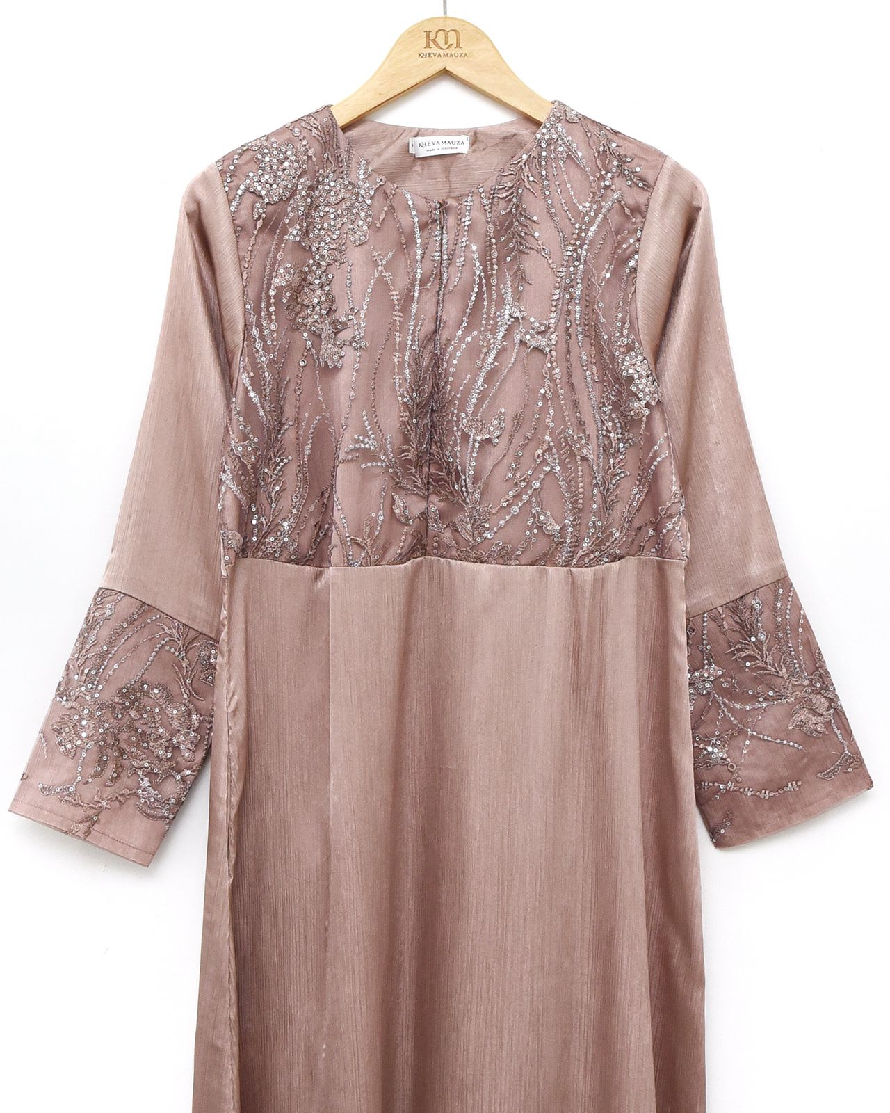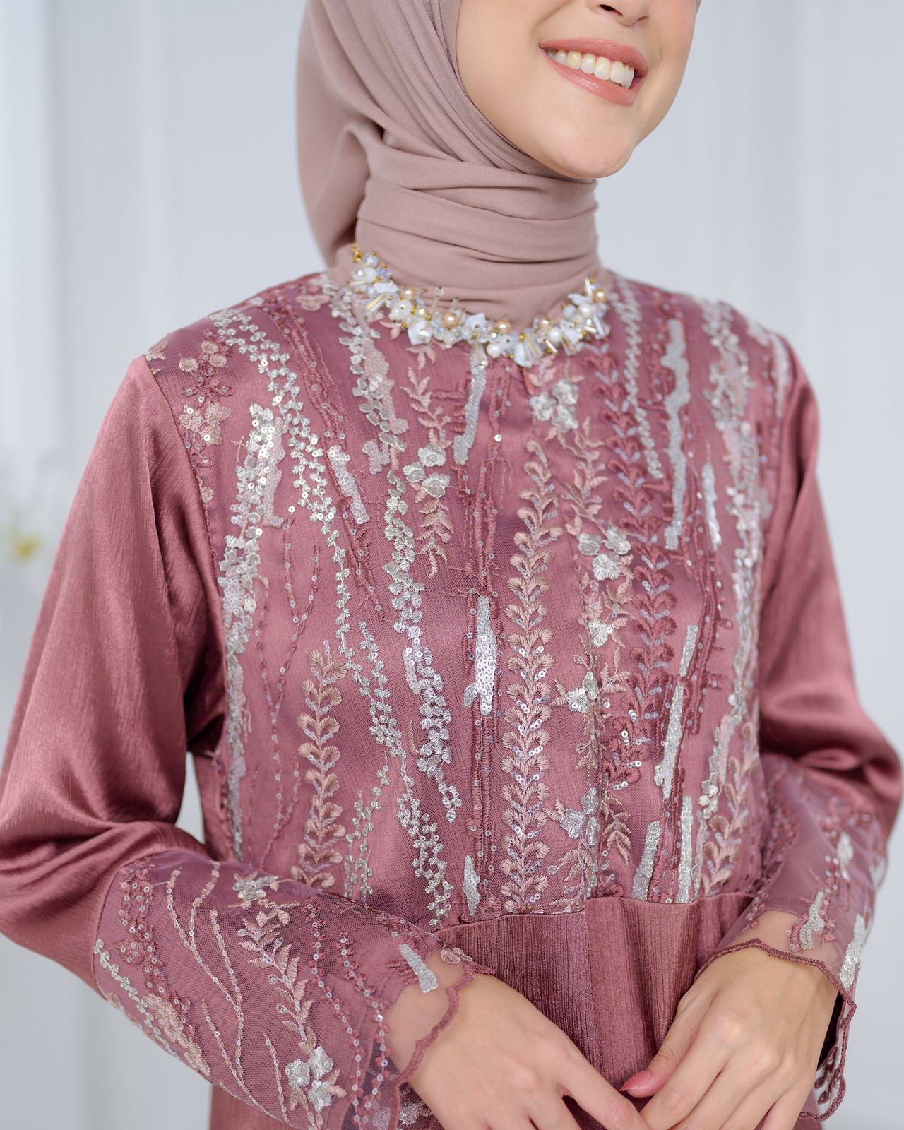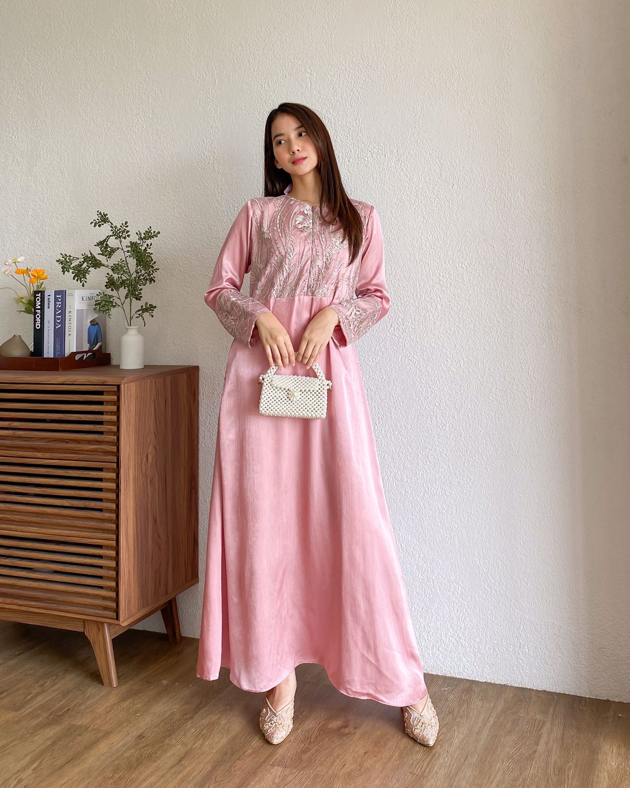 Bahan ini bertekstur sulur namun tetap halus, tidak kaku, tidak gampang kusut, tidak terlalu tebal, dan super flowy, jatuhnya cantik saat dipakai. Bahannya juga glossy, menambah kesan mewah pada dressnya. Brocadenya juga tidak kaku dan mewah dengan detail beadsnya