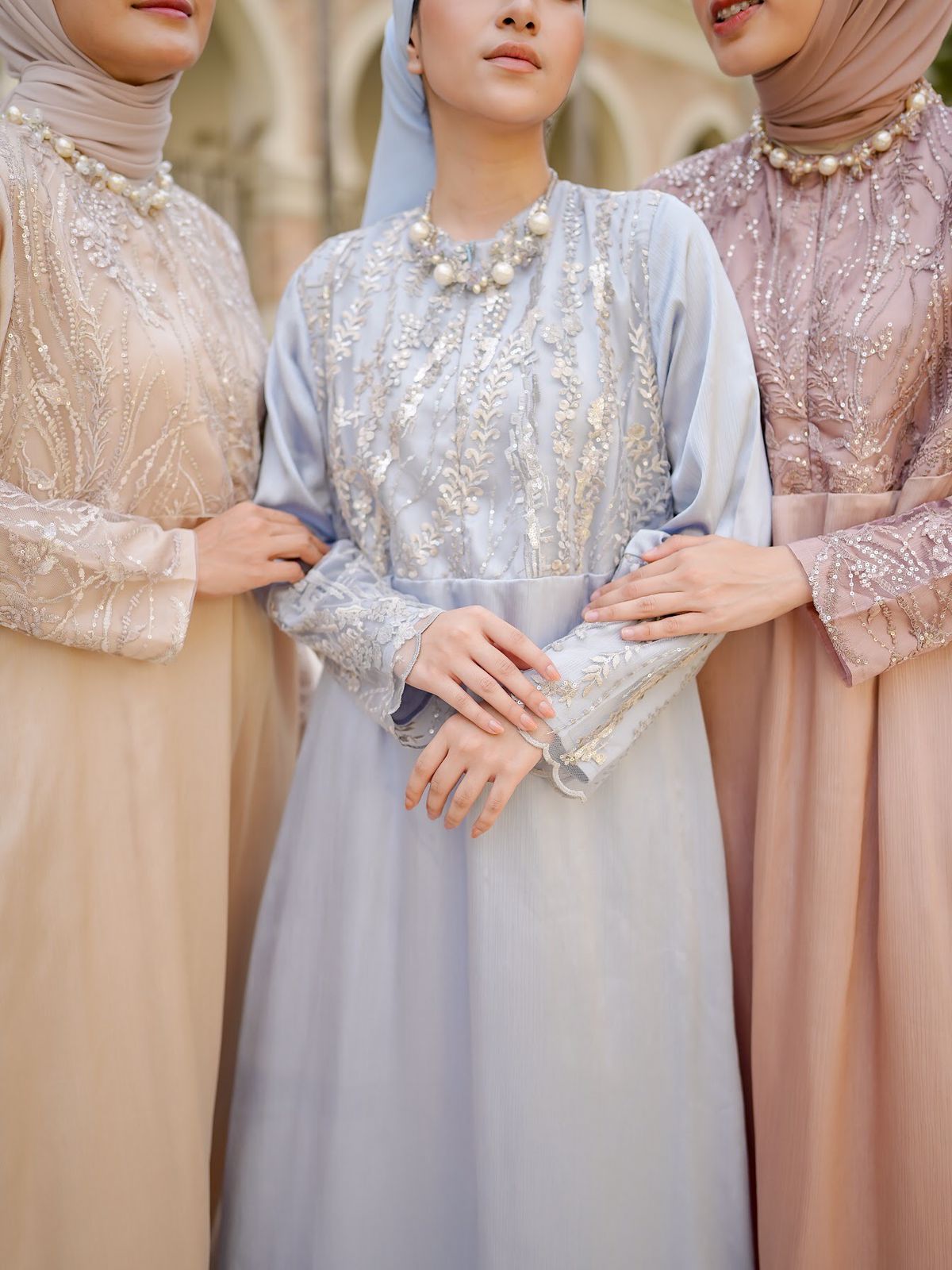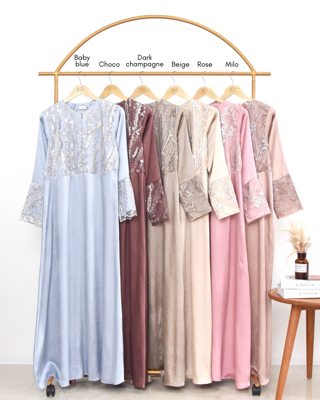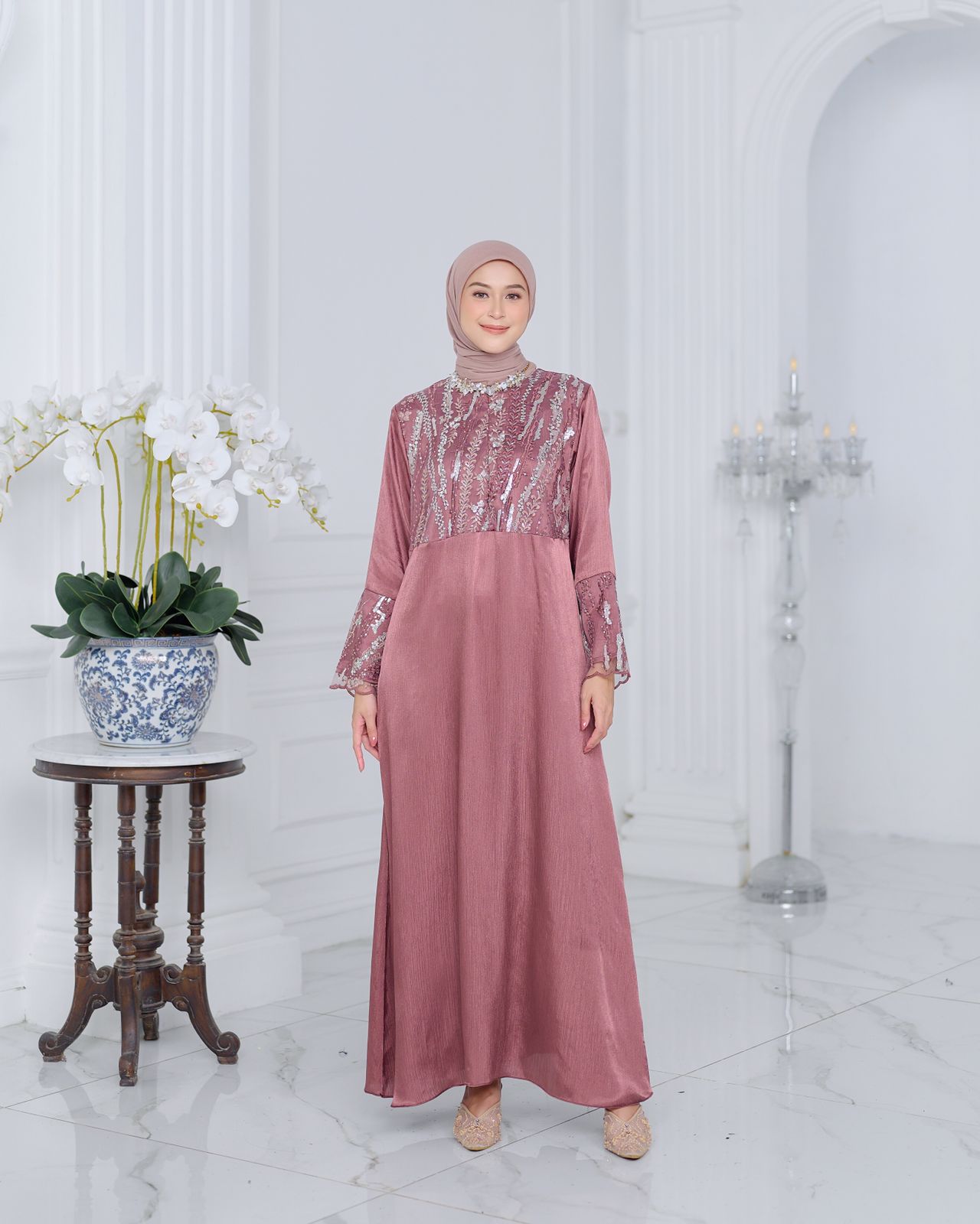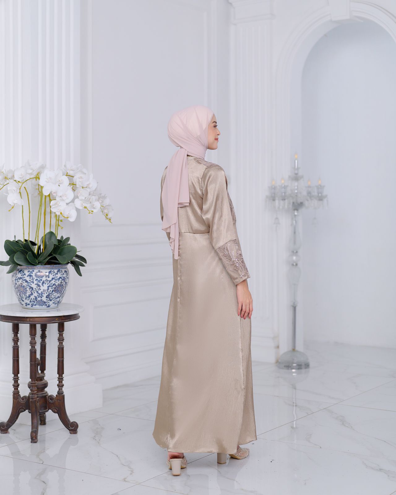 Bahan ini bertekstur sulur namun tetap halus, tidak kaku, tidak gampang kusut, tidak terlalu tebal, dan super flowy, jatuhnya cantik saat dipakai. Bahannya juga glossy, menambah kesan mewah pada dressnya. Brocadenya juga tidak kaku dan mewah dengan detail beadsnya